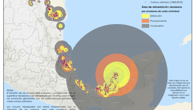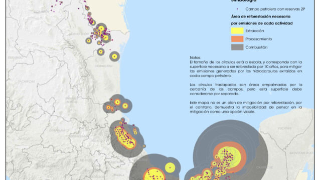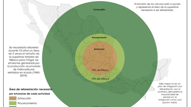 Manuel Llano de Cartocrítica explicó: “Para facilitar la comprensión de las emisiones, y expresarlas de manera cartográfica para cada campo petrolero, se realizó de manera ilustrativa una conversión de cuántos árboles habría que plantar y mantener por 10 años, para capturar las emisiones de bióxido de carbono equivalentes generadas por la extracción y uso de los hidrocarburos de cada campo petrolero”. Para las emisiones acumuladas por extracción, procesamiento y combustión de 1960 a 2019 sería necesario reforestar una superficie equivalente a 2.02 veces la totalidad de la superficie terrestre del país, por al menos 10 años. En cuanto a las posibilidades a futuro, para mitigar las emisiones potenciales de reservas 2P se requeriría un total de 112,325.36 millones de árboles, para los que sería necesario destinar una superficie que equivale al 57% de la totalidad de la superficie terrestre de México, por al menos 10 años. Evidentemente destinar estas áreas a la reforestación es absolutamente inviable por lo que se confirma que requerimos dejar nuestra dependencia en los combustibles fósiles y realizar una transición energética justa de forma urgente.